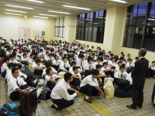 出発式「いざ行かん 学を修めに九州へ」ではじまった修学旅行(Y.W) 中学3年生157名欠席者無しで全員参加です。なによりです。 |