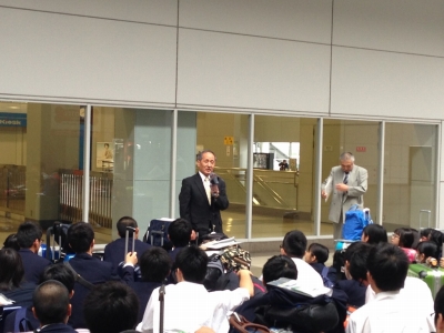 教頭先生から、学園長の言葉に触れながら、イギリス修学旅行の意義と、学園長自身はイギリス修学旅行に行ってない旨を紹介しつつ、たくさん学んできて下さいとの激励。 | |
