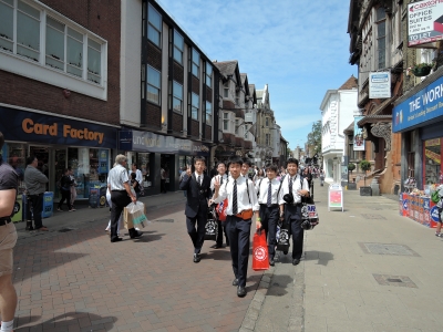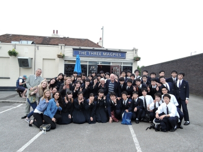 | 現地の方々と話したり、写真撮影をしたりと、有意義な時間をすごせました。(2組 T.O.) シェイクスピアの生家に入る前のところで役者さんが即興でロミオとジュリエットの芝居をやってくださったのが印象に残った。(5組 S.F.) 文化の違いを非常に感じた。明日も楽しみだ。(4組 Y.F.) オックスフォードでのガイドさんによる教会のつくりの説明が非常に興味深く、また、ハリー・ポッターの撮影で使われた場所もあり、楽しめました。(5組 M.F.) |