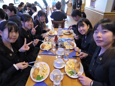 私たちの隣の席には、なんとオックスフォード大学の学生が!専門はスポーツ科学で、アイスホッケーをしているそうです。 N先生が、我々も明日、オックスフォードを訪れる予定の修学旅行団だと「英語で」伝え、盛り上がっていました。 |