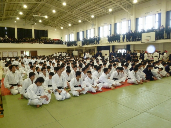 選手と補欠は柔道着で試合会場に、応援の生徒は周囲と2階に。