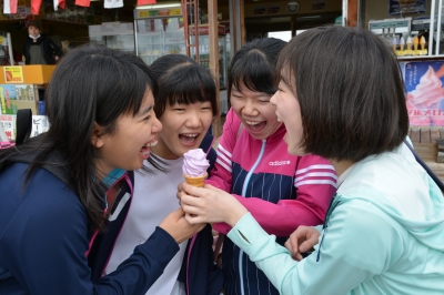 ガイドさんのマシンガントークに喜ぶ生徒たち。 |