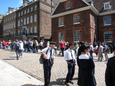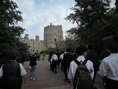 | 僕たちは4日目にウィンザー城へ行きました。今回行くところも全く知らないところです。しかし、僕たちは自分の知っている場所でわいわいするのではなく、知らないところでも適応してわいわいすることができます。まずは教会です。ここでは写真NGでいろいろな貴重なものが置いてありましたが、神聖な場所なのでわいわいできませんでした。次に衛兵の行進を見ました。凄い迫力があり本物の銃や剣を見て足がすくんでしまいました。やはりわいわいできませんでした。結論として初めて行く場所では事前に知っておかないとわいわいできず、バスの中でテンションが上がるものの、すぐに疲れて寝しまうことが分かりました。(M.H.) | |||