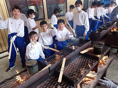 飯盒炊爨です。調理班と竈班に手分けして調理。オリエンテーリングで高得点を取ったチームには追加のお肉がありました。