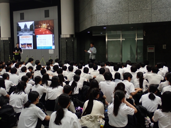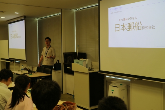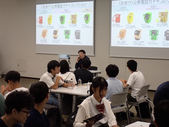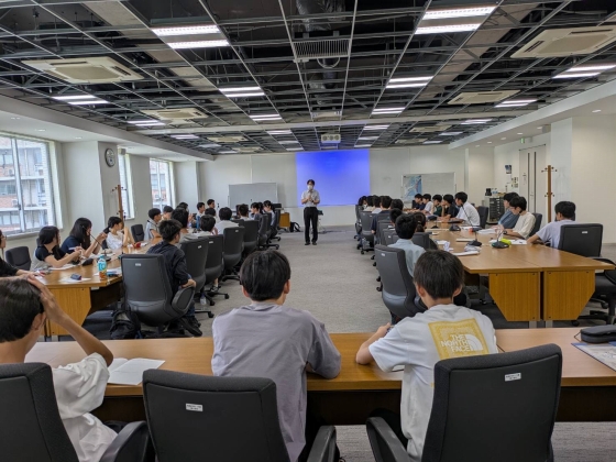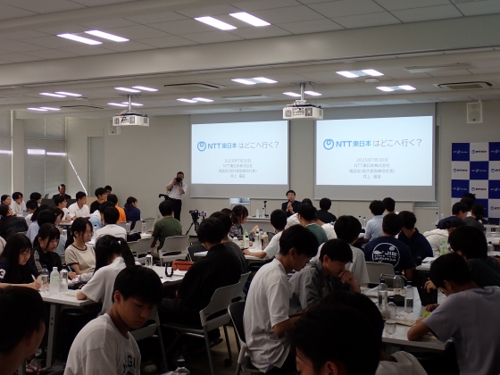 調布市まで皆で移動し、NTT-e-cityLaboまでやって来ました。まず初めに、OBの井上氏の講演会です。