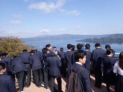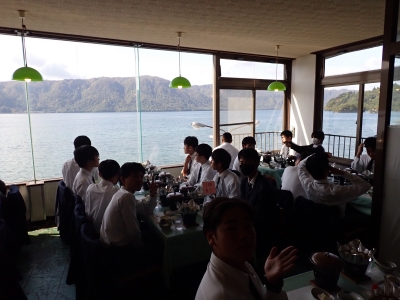 十和田湖で記念撮影の後、十和田湖を見ながら昼食。きりたんぽと十和田バラ焼きをいただきました。