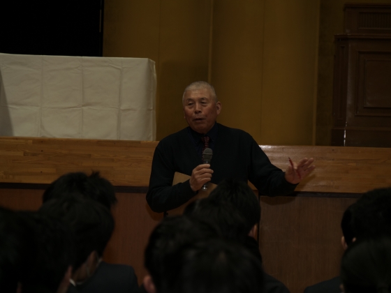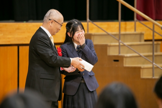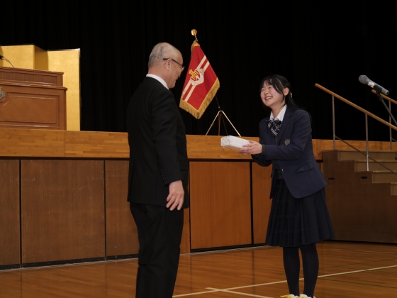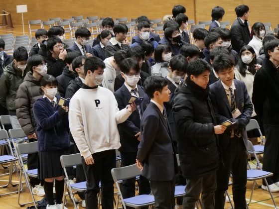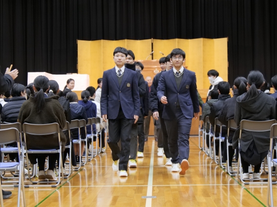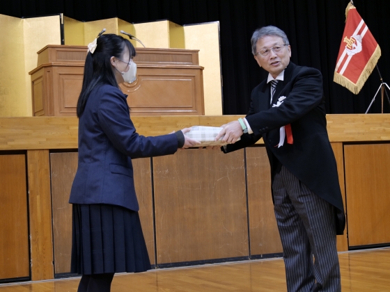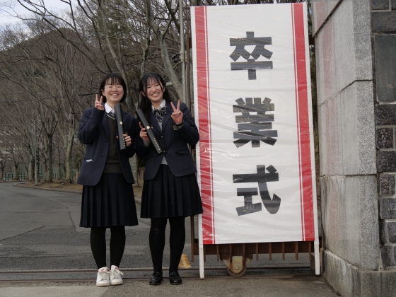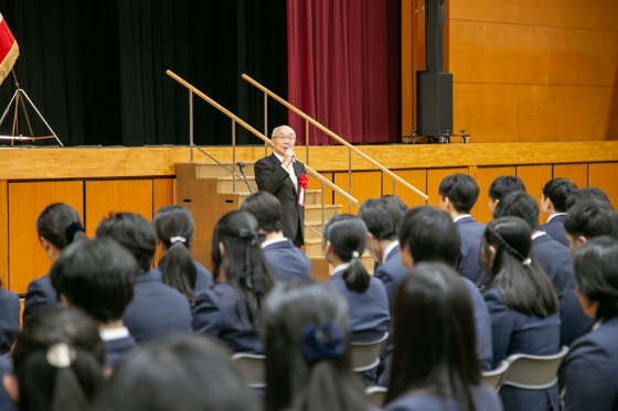 さて、このように3年間を振り返るとき、皆さんの胸にはさまざまな思いがこみ上げてくることでしょう。 あの時挑戦しようしたけれど、壁に阻まれた― ―そんな経験もあったかもしれません。 悪天候や病気は、その時の自分の力ではどうにもならない壁です。しかし、できないのであれば発想を転換し、取り止めたり、 延期したり、或いは別の方法を考えたりすることができました。一方で、自分で勝手に壁を作り、挑戦しなかったことはなかったでしょうか。 数学や英語が苦手だと思い込み、公式や単語などを覚えなければいつまでも苦手なままです。 目先の試験などにとらわれず、まずは徹底してやってみることが大切です。そうすれば何でも好きになり、覚えることも次第に楽しくなったはずです。
